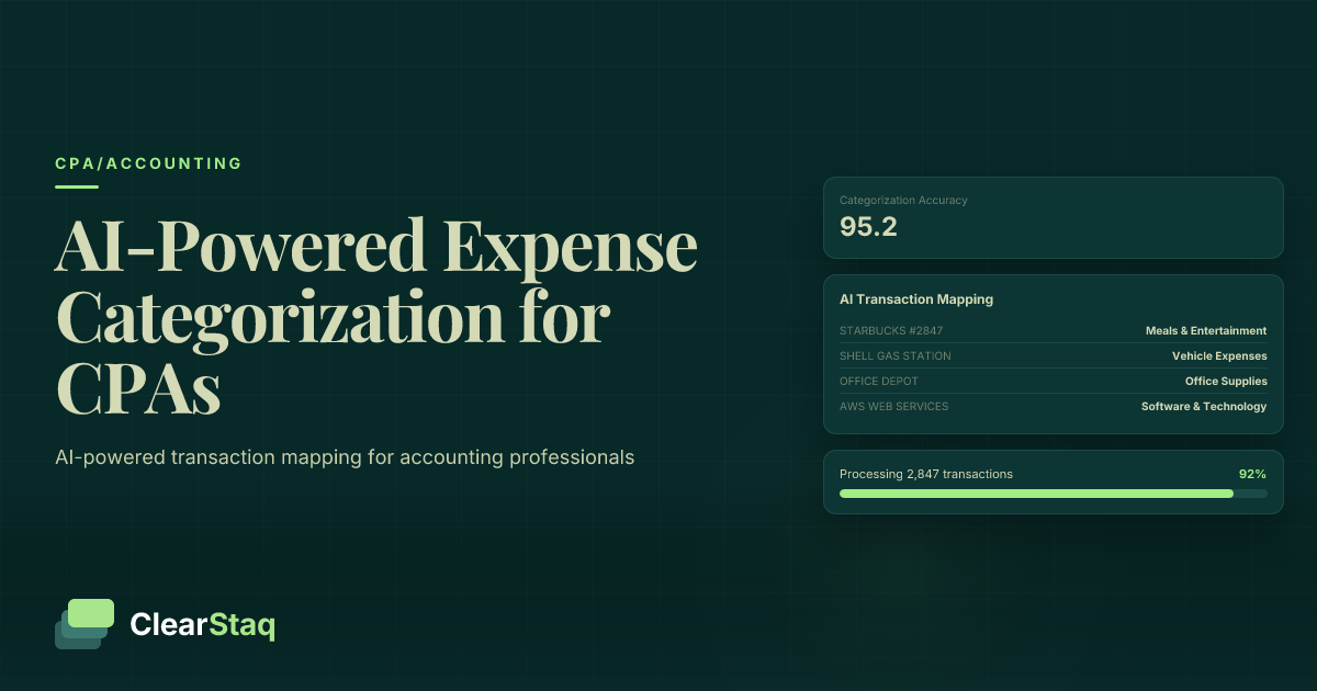 Stop categorizing expenses manually. ClearStaq's AI processes bank statements and maps transactions to your chart of accounts automatically — with 95%+ accuracy and fraud detection built in.