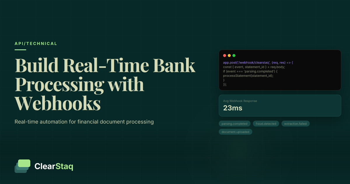 Webhook bank statement processing allows real-time automation by triggering downstream workflows the moment ClearStaq completes parsing or fraud analysis. This eliminates polling delays and enables instant processing of parsed data, fraud alerts, and extraction events through HTTP callbacks to your application endpoints.