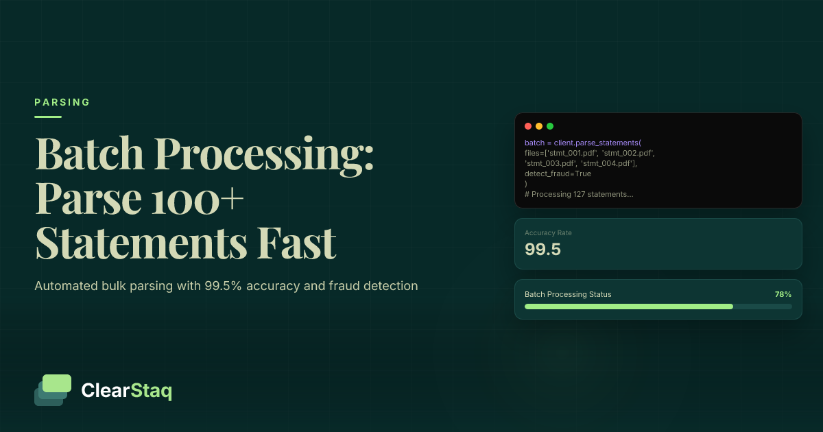 Stop processing bank statements one by one. ClearStaq's batch processing handles 100+ statements in minutes with 99.5% accuracy and complete fraud detection.