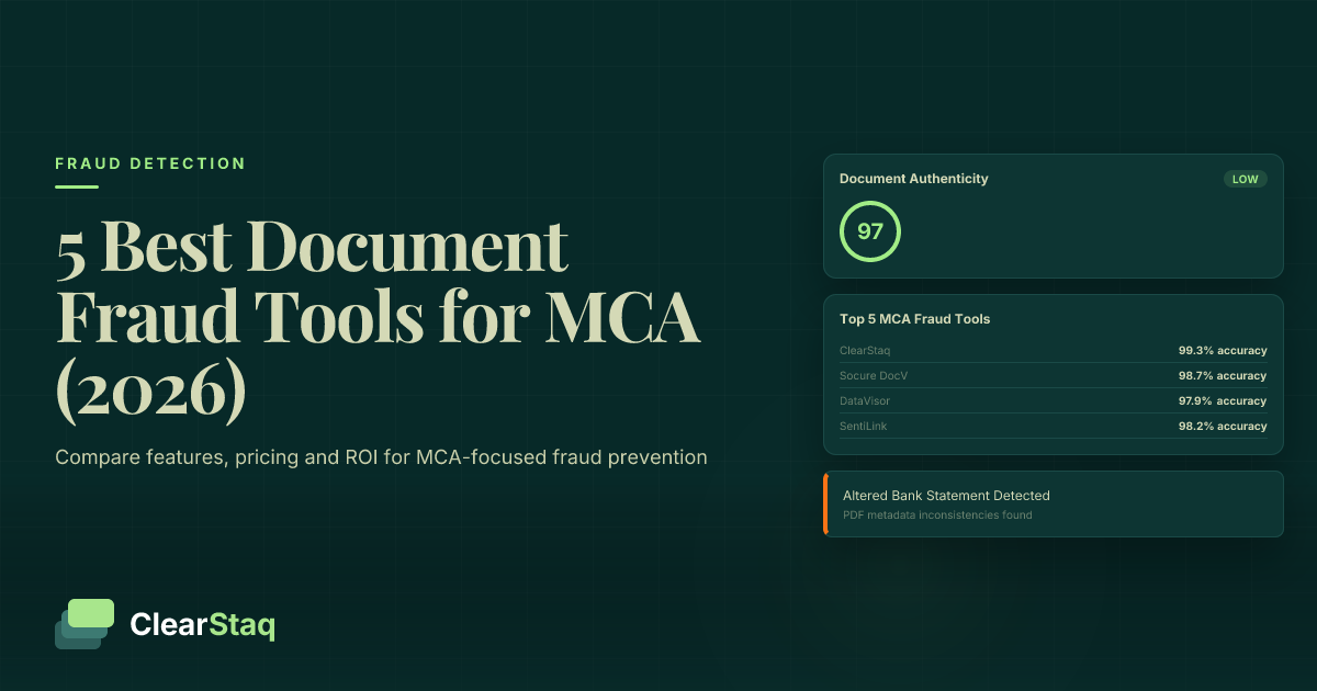 The best document fraud detection tools for MCA brokers in 2026 include ClearStaq, Socure DocV, DataVisor, SentiLink, and Jumio. These platforms use AI to analyze PDF metadata, detect altered documents, and integrate with MCA workflows for real-time fraud scoring with 99%+ accuracy rates.