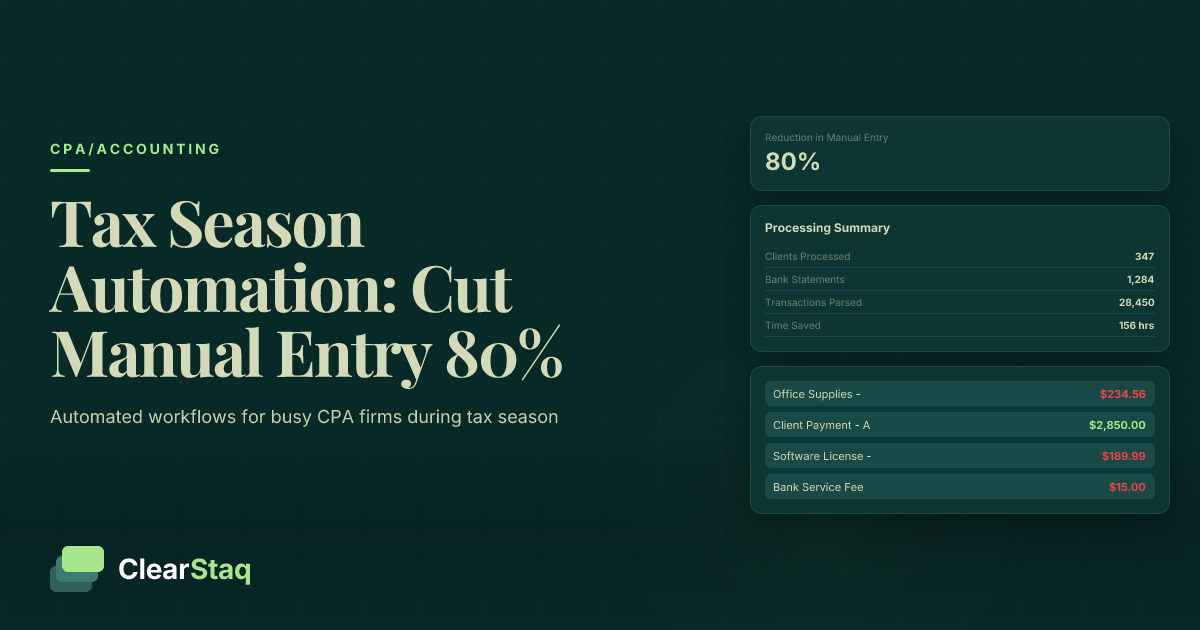 CPAs can reduce manual data entry by 80% during tax season through automated bank statement processing, expense categorization, and multi-client batch processing. Key automation areas include document parsing, transaction categorization mapped to chart of accounts, and API integration with existing tax software workflows.